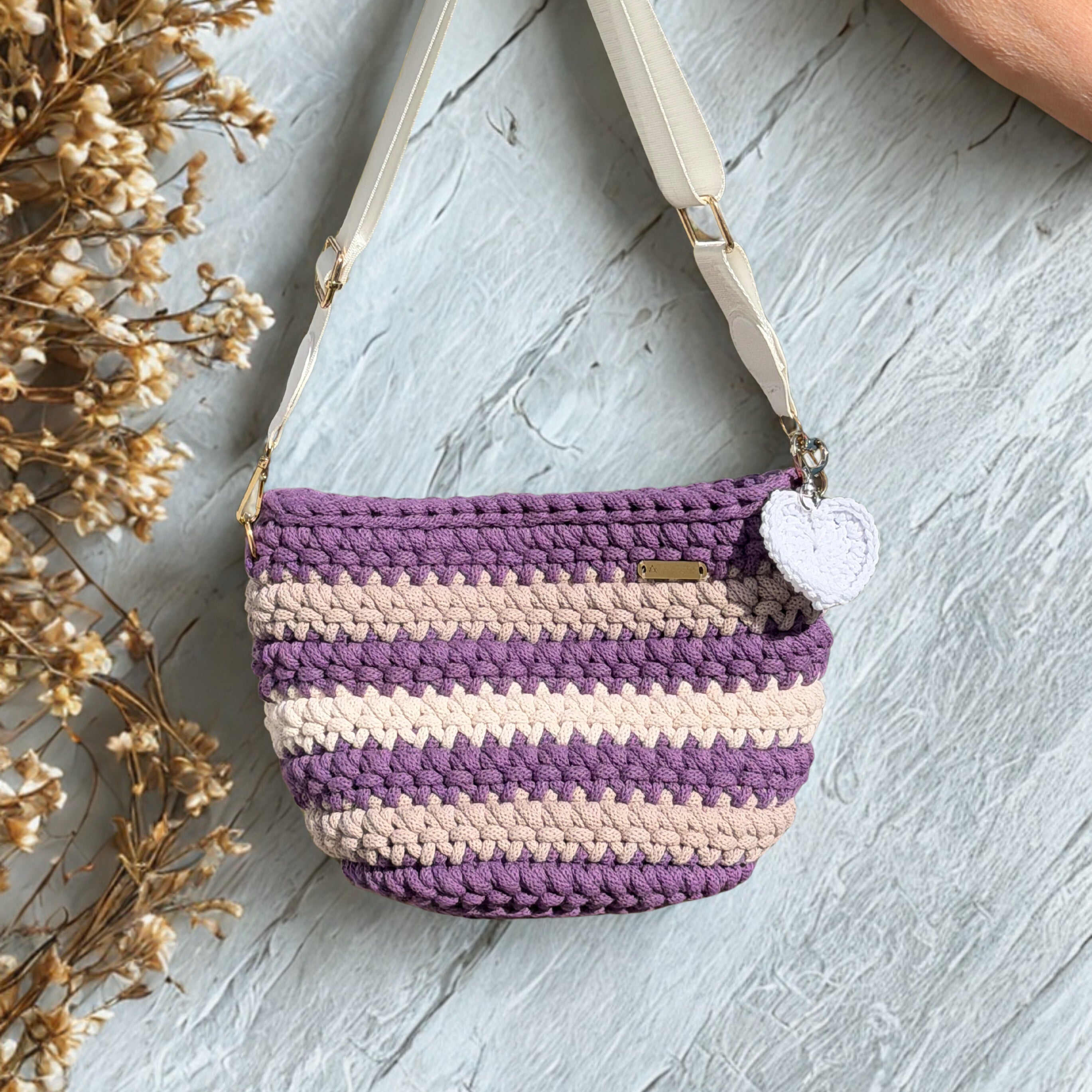 The Arwen (Small) – Handmade Crochet Crossbody Bag in Ivory, Purple, and Pearl